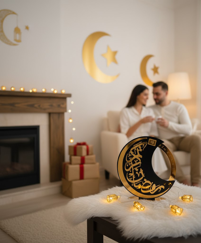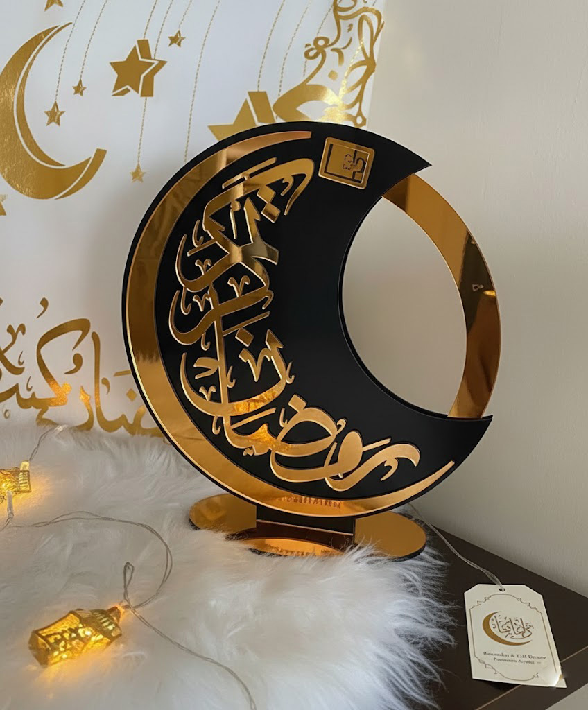 Add a touch of elegance to your home with this black and gold crescent moon acrylic tablepiece. Perfect for Ramadan, Eid, or year-round decor, this 25x25 cm ornament blends spirituality with modern style.