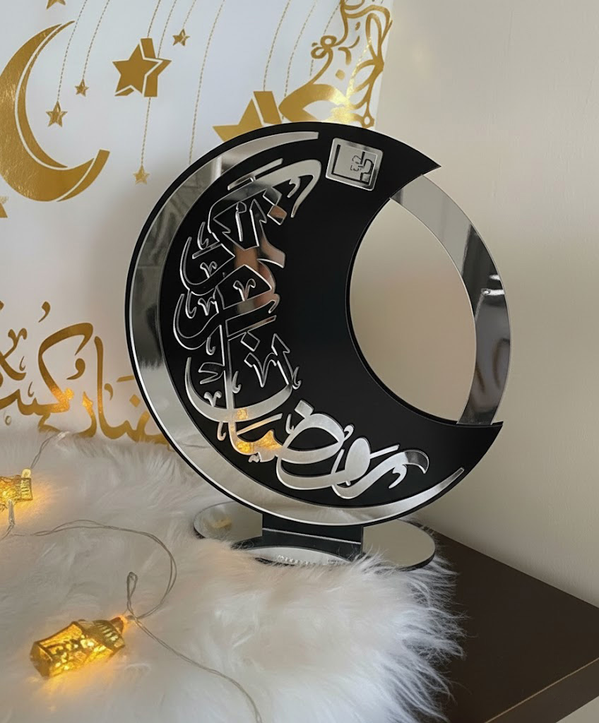Add elegance to your home with this black and Silver acrylic crescent moon tablepiece. Perfect for Ramadan, Eid, or year-round decor, this 25x25 cm ornament blends spirituality with modern sophistication.