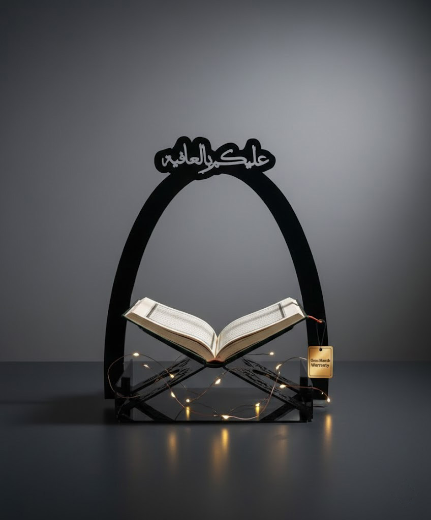 Elegant black acrylic Quran and book stand with Arabic calligraphy. Stylish, durable, and perfect for home or prayer spaces.