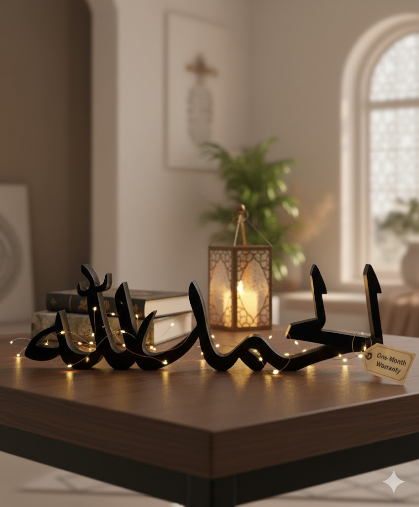 Elegant black acrylic "Alhamdulillah" table decor, perfect for Ramadan, Islamic celebrations, or everyday spiritual reminders. Stylish, durable, and ideal for any space.