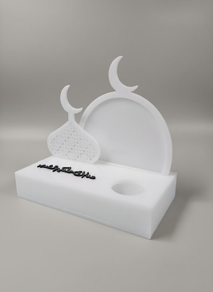 Celebrate Ramadan with this beautifully crafted wooden and acrylic tabletop décor in black and silver. Featuring intricate Islamic patterns, it adds elegance to any space.