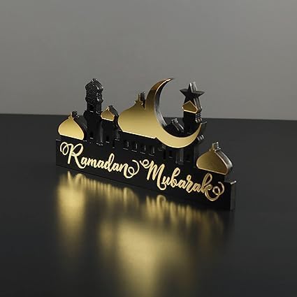 Elegant Ramadan tabletop décor crafted from wood and acrylic in a black and gold finish. A compact Islamic decorative piece, perfect for shelves, tables, or gifting.