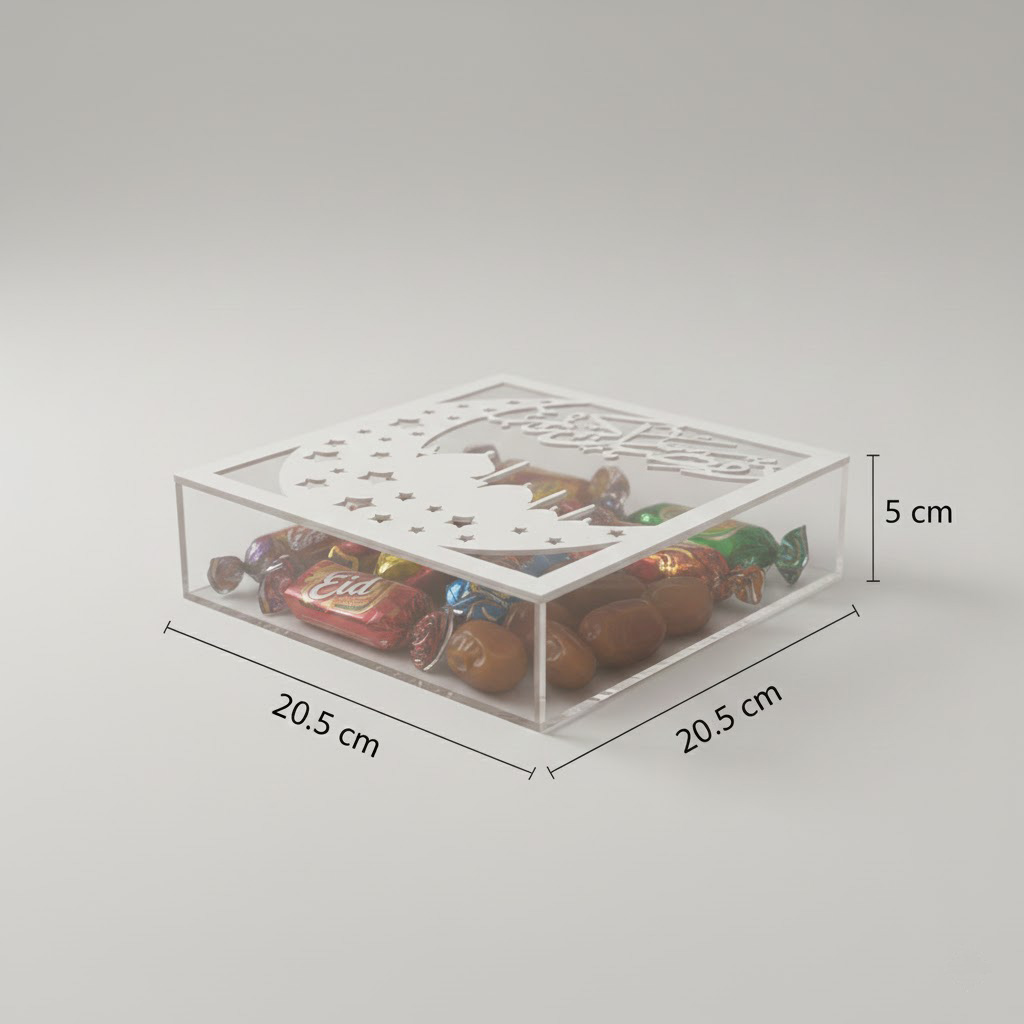 Elegant white acrylic Ramadan gift box featuring a laser-cut crescent and mosque design. Ideal for gifting, sweets, and festive décor. Premium quality, modern finish, and one-month warranty.