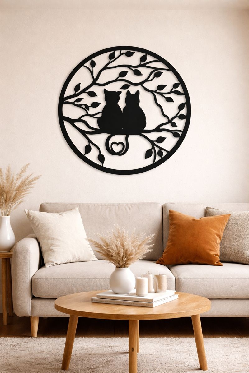 Charming 60x60 cm black acrylic wall art with romantic cat silhouette on a branch.