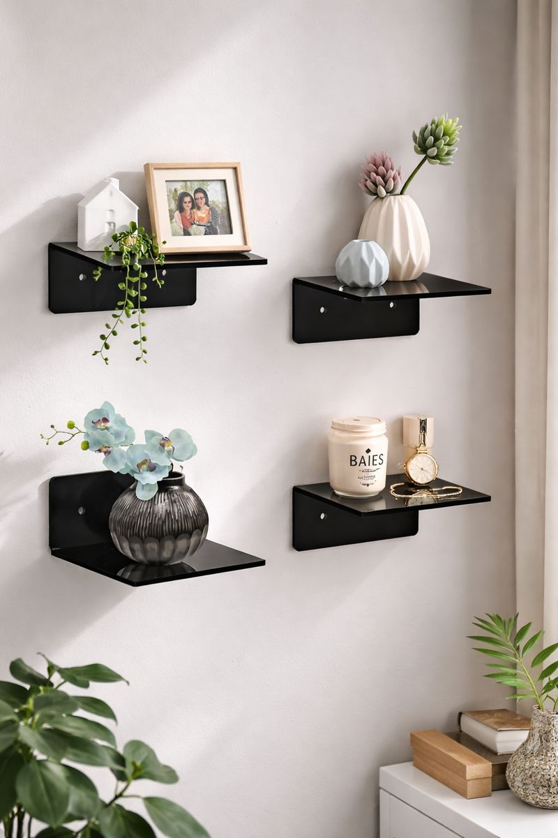 Enhance your space with this set of 4 black acrylic floating shelves. Featuring a sleek modern design, they are durable, compact, and easy to install, perfect for plants, decorations, and storage in any room.