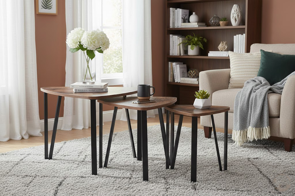 Stylish set of 3 nesting tables with wood tops and black metal frames. Perfect as side, sofa, or bed tables—space-saving, durable, and versatile for modern or rustic interiors.